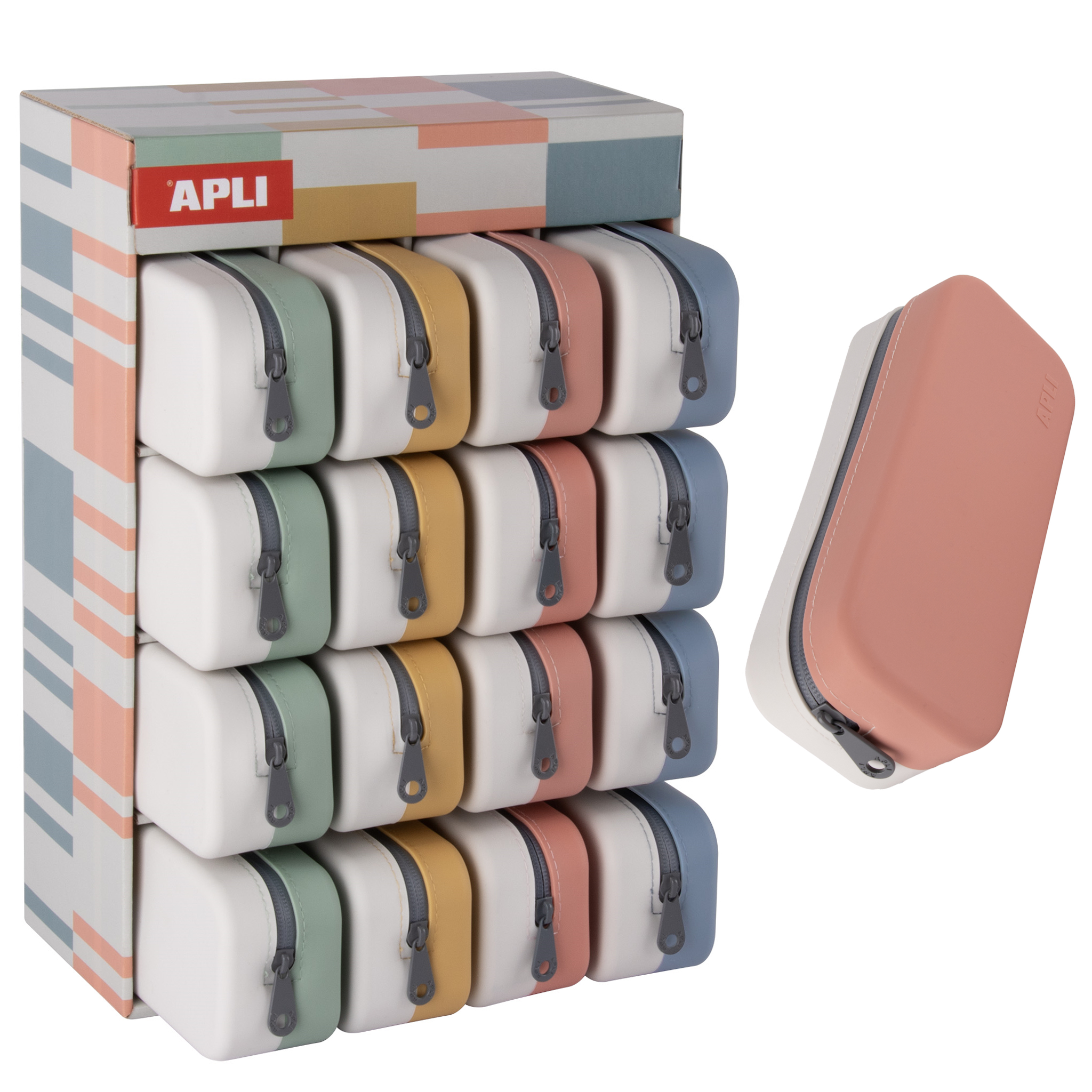 Cada expositor contém 16 estojos para lápis com dimensões de 75 × 185 × 55 mm. Disponível em 4 combinações de cores sortidas: cáqui e cinza, mostarda e cinza, rosa e cinza e azul e cinza.